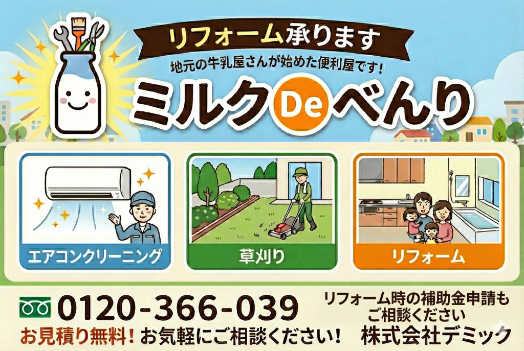 地元の牛乳屋が始めたべんり屋「ミルクDeべんり」は、今年も多くの方からお問い合わせいただきました。多くの声にお応えしている中で、西宮北店、兵庫店ではリフォームも 承れるようになりましたので、まずはどんなことでもお問合せください。