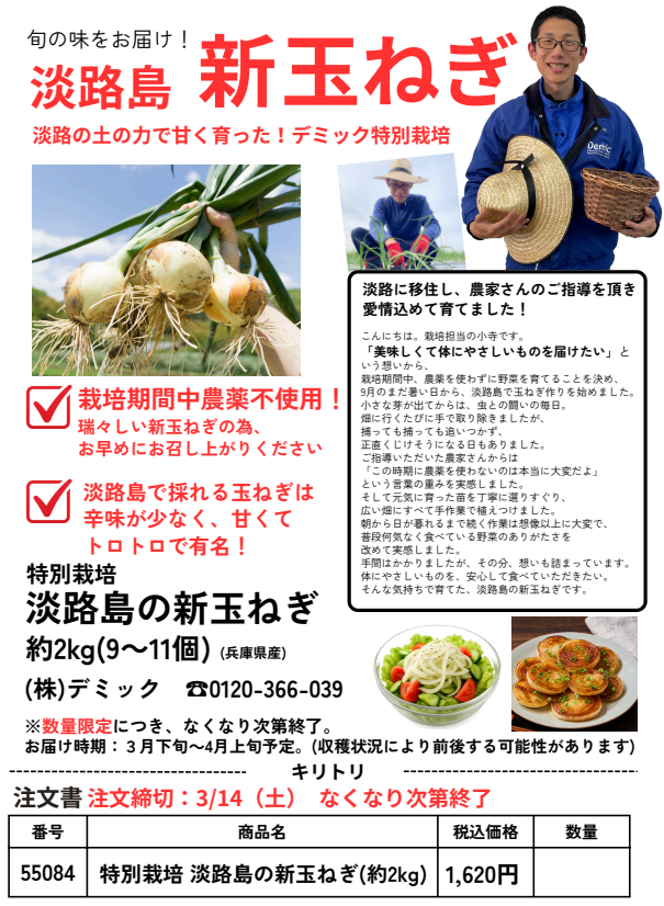 生活習慣病の多くは日々の食生活の積み重ねが影響すると言われています。だからこそ、毎日食べる野菜には意味があると考え、その第1歩がこの玉ねぎプロジェクトです。 社員が淡路に移住して栽培中には農薬を使わない特別栽培で作った淡路の新玉ねぎが3月下旬から収穫予定ですので、ぜひ一度お買い求めください。